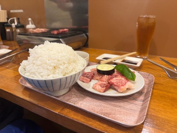 この前の土曜日。カウンター焼肉ひできへ~、カルビ定食ごはん大盛です。なかなかな飯の量、ありがとうございます。奥にスープもあります。十分オナカイッパイ。ナスとピーマンはお隣にあげました。