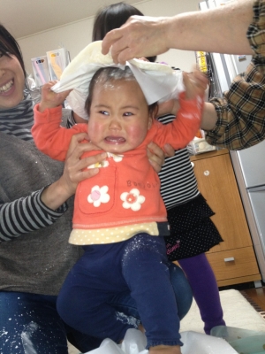 27日は下のムスメの1歳の誕生日で、モチ踏みでした。上と下でモチはさみみたいな~。