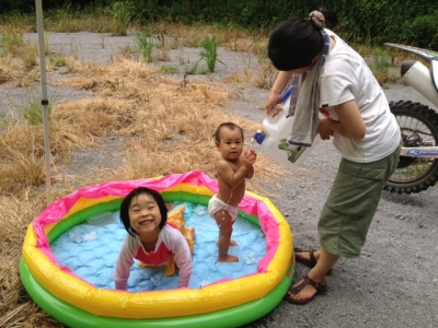 嫁もコドモたちも一緒に行きまして、水がないコースに保冷剤と少ない水で水浴びしておりました。空気いれたのもちワタシです。必死でコドモのために嫁の点数稼ぎのためフ~フ~しました~。