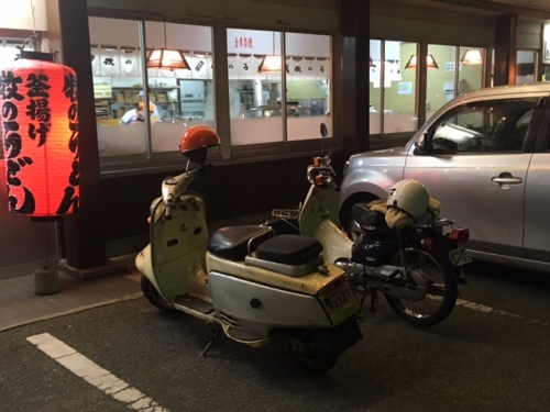 この前、ナイトランってゆう試乗に糸島半島グルっと、ウサギとカブで。帰りに牧のうどん。