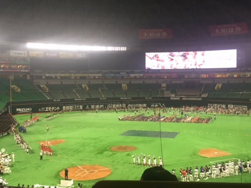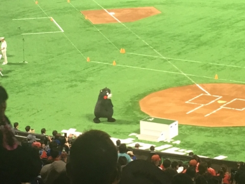 その後から福岡ドームで少年ソフトボールの開会式。ムスメがダンス踊るゆうもんですから見にきたんです。何故かクマモト熊モン。