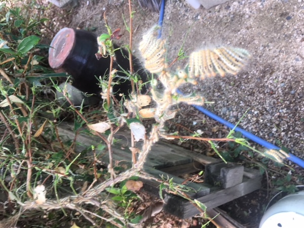 でもよ~く見たらケムシさん。ハッパの上乗っておいでです、枝、木にもビッシリ! かなりヒキました。ニキビぐらいサブイボがでました。これにいつも触れてたんですね~、そりゃなるわ、ちょっと安心。まだ長生きできそ~です。